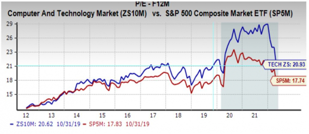 The chart shows that the Zacks Tech sector is currently trading at 20.9X forward 12-month EPS estimates, which is roughly -27% below where the sector traded at the start of the year and about where the sector was trading at the end of 2019.