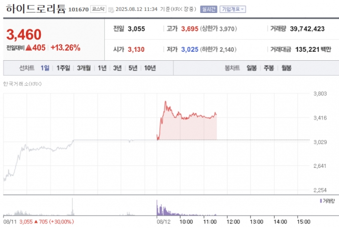 탄산리튬 선물가격이 올랐다는 소식이 지난 주말 전해지면서 국내 증시의 리튬 관련주들이 급등하고 있다. 미국 증시에서도 리튬 관련주는 크게 올라 주목받았다. 12일 오전 11시 10분 기준 하이드로리튬은 전일 대비 360원(11.78%) 오른 3415원에 거래되고 있다. 3거래일 연속 상승세다. 전일 하이드로리튬은 상한가를 기록했다. 지난 7월 2일에는 1277원까지 내려 52주 신저가를 기록, 이후 한 달 만에 3000원대를 회복했다. 리튬포어스는 같은 기준 전일 대비 97원(6.06%) 오른 1697원에 거래 중이다. 리…