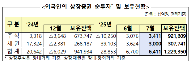 외국인 투자자들이 지난달 국내 주식을 3조원 넘게 순매수한 것으로 나타났다. 다만 정부의 세제개편안 발표 이후 하루에만 7000억원 넘게 순매도하는 등 불안한 모습도 감지된다. 7일 금융감독원이 발표한 ‘2025년 7월 외국인 증권투자 동향’에 따르면 외국인 투자자는 지난달 상장주식 3조4110억원어치를 사들이며 3개월째 순매수세를 나타냈다. 코스피 시장에서 3조7830억원을 순매수, 코스닥 시장에서 3720억원을 순매도했다. 외국인의 순매수 규모는 △5월 2조100억원 △6월 3조760억원 △7월 3조4110억원 등으로 매달 …